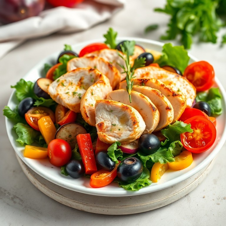 Een kleurrijke en gezonde salade met sappige kipfilet en gegrilde groenten zoals paprika, courgette en aubergine. Deze salade is perfect voor een zomerse lunch en combineert frisse smaken met een lichte dressing van citroen en olijfolie.