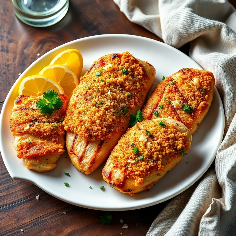 Saftige Hähnchenbrustfilets werden mit einer aromatischen Parmesan-Kräuter-Kruste überzogen und auf dem Grill goldbraun gegart. Dieses Gericht ist perfekt für ein elegantes Grillabendessen und überzeugt durch eine knusprige Textur und intensiven Geschmack. Die Kombination aus zartem Fleisch und würziger Kruste macht es zu einem Highlight für Gäste und Familie.