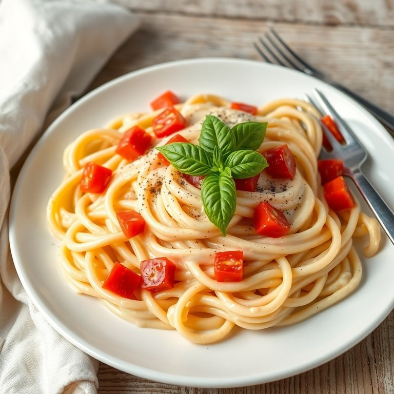 A rich and comforting pasta dish featuring tender noodles enveloped in a velvety garlic and cream cheese sauce, topped with fresh, juicy tomatoes and freshly ground black pepper. This easy-to-make recipe balances the creaminess of the sauce with the brightness of ripe tomatoes, making it a perfect weeknight dinner that feels indulgent yet fresh.