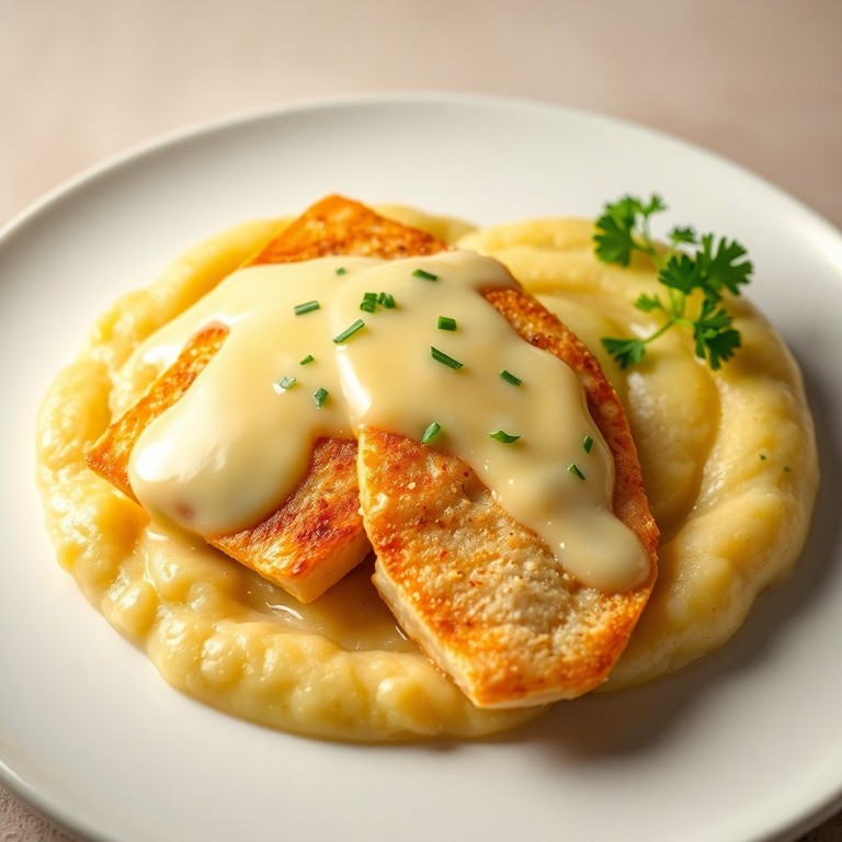 Peixe Tilápia ao Molho de Queijo com Purê de Banana da Terra