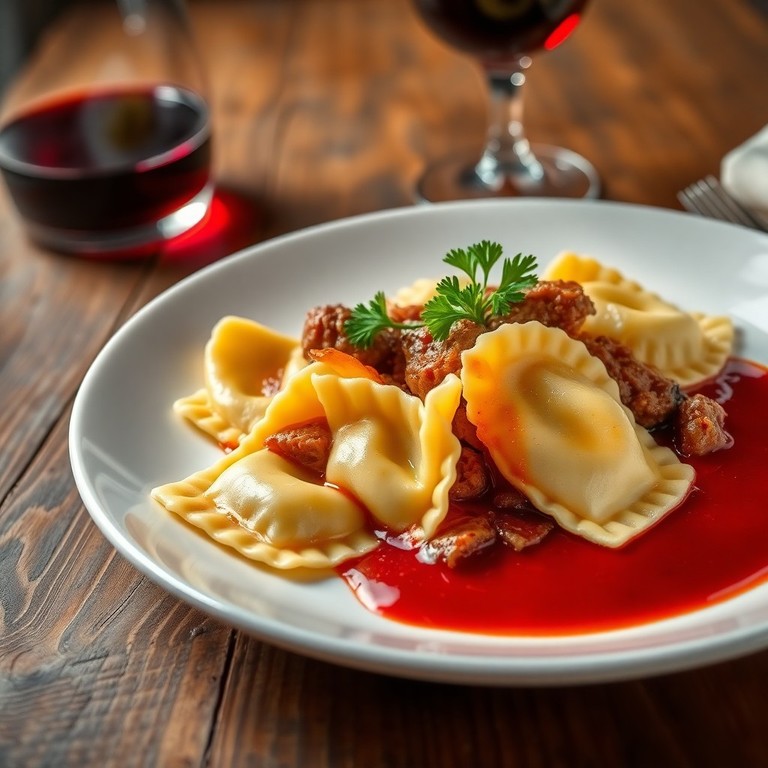 Deliciosos ravioles sin gluten con un relleno jugoso de osobuco desmechado, acompañados de una salsa de vino tinto, ideales para una cena elegante y sin gluten.