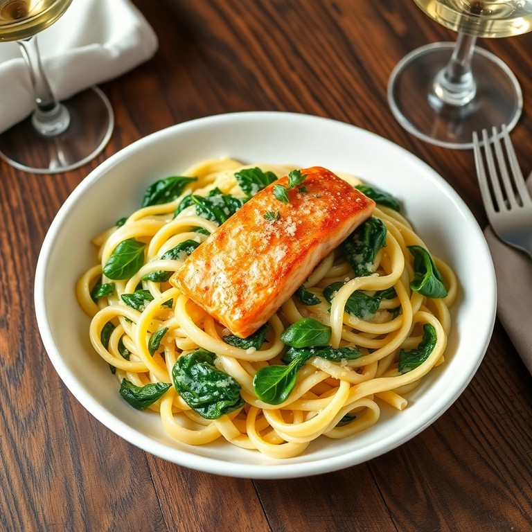 A luxurious and creamy pasta dish featuring tender, pan-seared salmon fillets nestled in a rich garlic cream sauce with sautéed fresh spinach. This elegant yet quick recipe balances the delicate flavors of salmon and spinach with a velvety sauce, making it perfect for a refined weeknight dinner or special occasion.