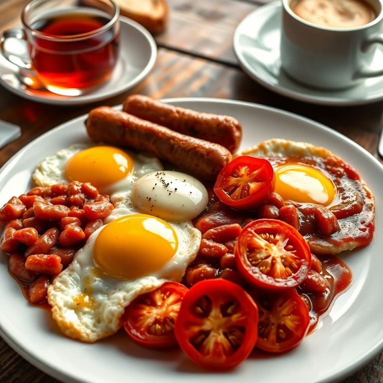 Традиционный английский завтрак — это сытный и сбалансированный набор из яичницы, хрустящих колбасок, жареных бобов и сочных помидоров. Идеально подходит для полноценного начала дня, сочетая в себе разнообразие вкусов и текстур.