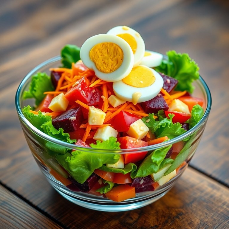 Uma salada fresca e nutritiva que combina cenoura ralada, beterraba cozida, alface crocante, tomate suculento e mandioca macia, tudo envolvido em uma maionese leve e cremosa. Perfeita para uma refeição rápida, essa salada traz cores vibrantes e sabores equilibrados, enriquecida com ovos cozidos para um toque extra de proteína.