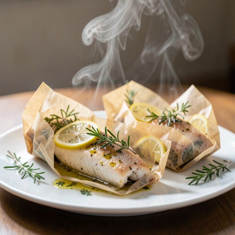 Peixe branco delicadamente cozido no vapor dentro de seu próprio envelope de papel manteiga. Este método preserva a umidade e infunde o filé com o frescor do limão siciliano, alho e um bouquet de ervas aromáticas, resultando em um prato leve, saudável e extremamente saboroso.