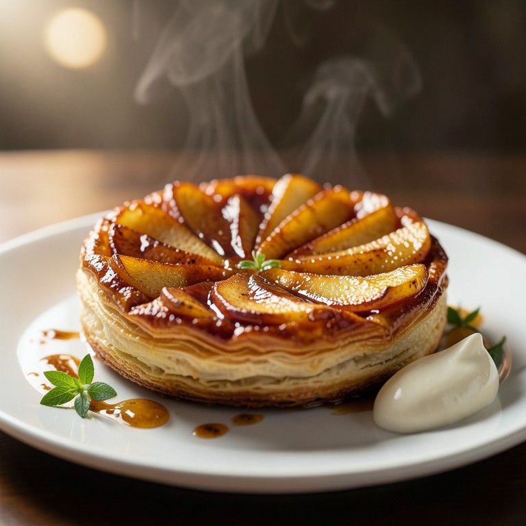 Une interprétation classique de la tarte Tatin, avec des pommes et des poires dorées dans un caramel au sucre roux et à la cannelle, le tout sur une pâte brisée croustillante. Cuisson au four.