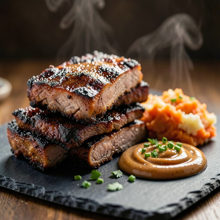 Travers de Porc Façon Memphis Grillés, Purée Rustique aux Carottes et Crème d'Oignons