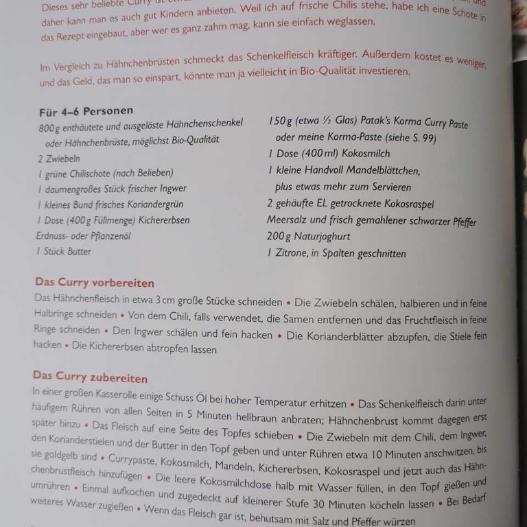 Korma Paste selber machen: 2 Knoblauchzehen 1 daumengrosses Ingwerstück ½ TL Cayenne Pfeffer 1 TL Garam Masala ½ TL Salz 2 EL Rapsöl 1 EL Tomatenmark 2 grüne Chilis 3 EL Kokosraspeln 2 EL gemahlene Mandeln 1 Bund Koriander Zum rösten: 2 TL Kreuzkümmelsamen 1 TL Koriandersamen Zubereitung: Gewürze zum rösten auf mittlere Hitze rösten. Nach dem rösten, Mörsern. Danach mit den übrigen Zutaten zu einer Paste verarbeiten. Zubereitung:
