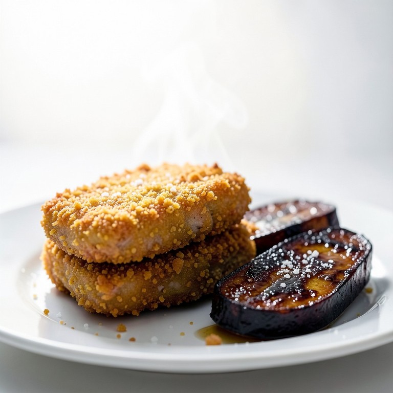 A classic pairing featuring savory, ultra-crispy breaded cutlets served alongside sweet, caramelized fried ripe plantains, balancing salty and sweet flavors perfectly.