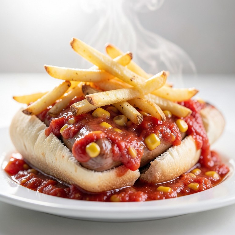 Um cachorro-quente rápido e reconfortante, onde salsichas são banhadas em um molho caseiro saboroso de tomate, temperado com alho e cebola, e enriquecido com milho verde. Finalizado com batata palha crocante.