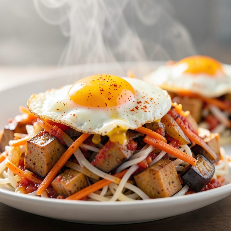 Un plato reconfortante y rápido que combina la textura suave de la berenjena salteada con fideos de arroz ligeros, todo ligado por una salsa de tomate y pimentón, coronado con un huevo frito o pochado.