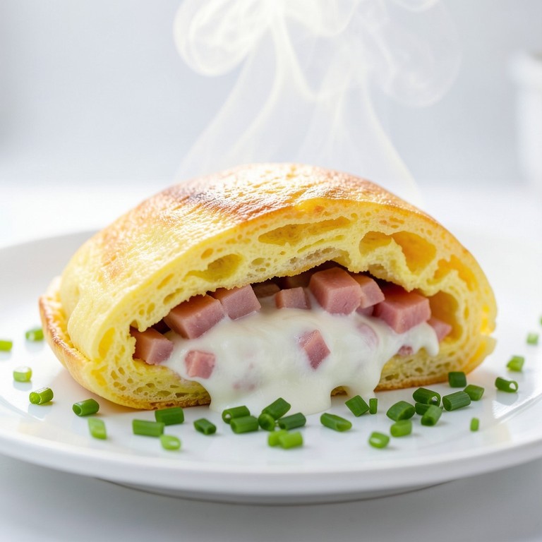 Uma omelete clássica, macia e aerada, recheada com queijo derretido e presunto, pronta em minutos para um café da manhã ou lanche rápido e satisfatório.