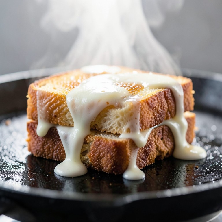 Fatias de pão doce tostadas na chapa até ficarem perfeitamente douradas, recheadas com uma camada quente e cremosa de doce de leite e cobertas com queijo derretido. Uma sobremesa rápida e indulgente.