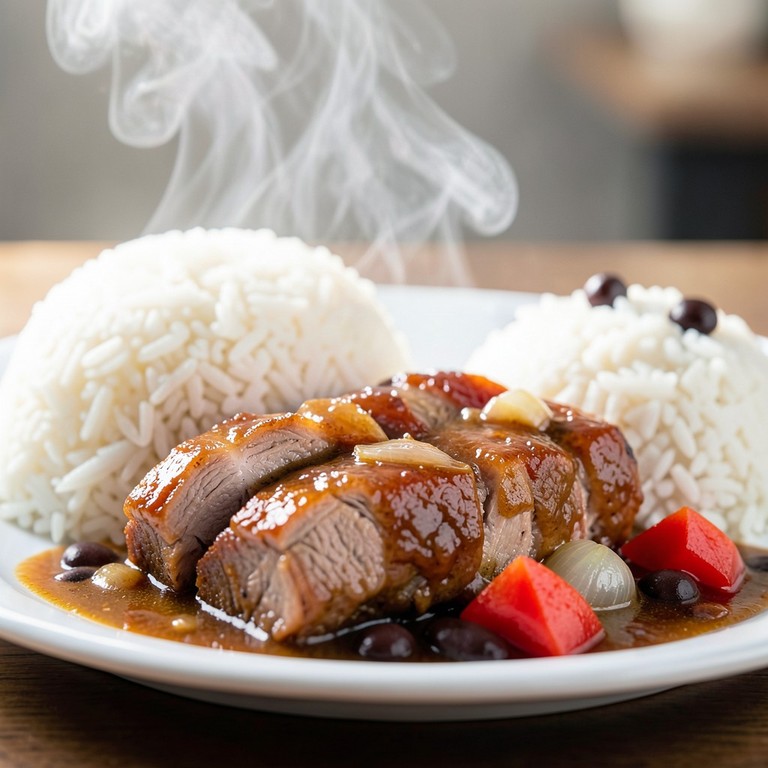 Fatias suculentas de lombo suíno seladas e cobertas com um molho agridoce caseiro à base de abacaxi e vinagre, criando um contraste perfeito para acompanhar o tradicional arroz e feijão.