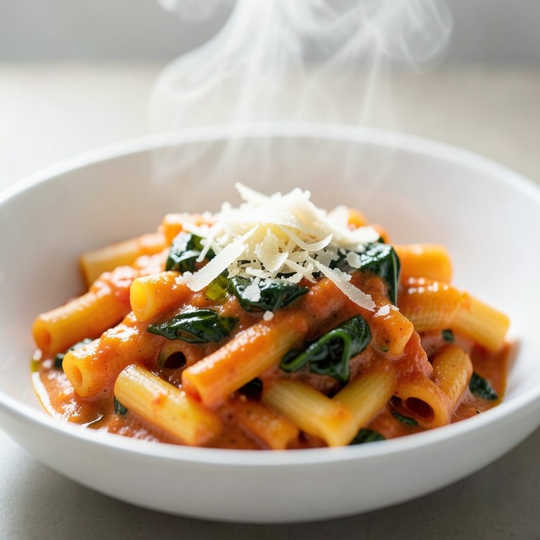 A quick, kid-friendly, one-pot pasta dish featuring short pasta simmered in a rich tomato cream sauce, finished with fresh spinach and Parmesan cheese, ready in under 15 minutes.