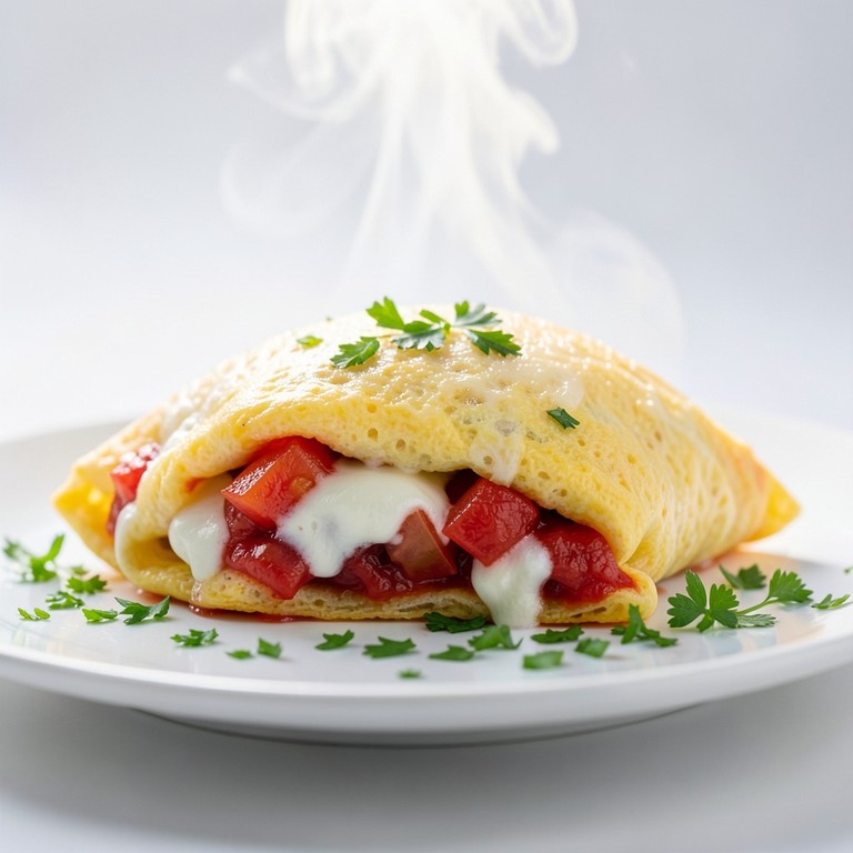 Uma omelete fofinha e saborosa, enriquecida com farinha de cuscuz para textura, recheada com um molho de tomate caseiro, tomate fresco e queijo derretido. Ideal para um café da manhã nutritivo ou um lanche rápido.