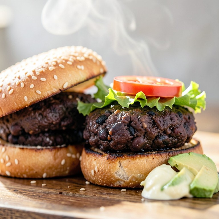 Flavorful vegetarian burgers made from mashed black beans, spices, and breadcrumbs, pan-fried until golden brown and served hot on soft buns.