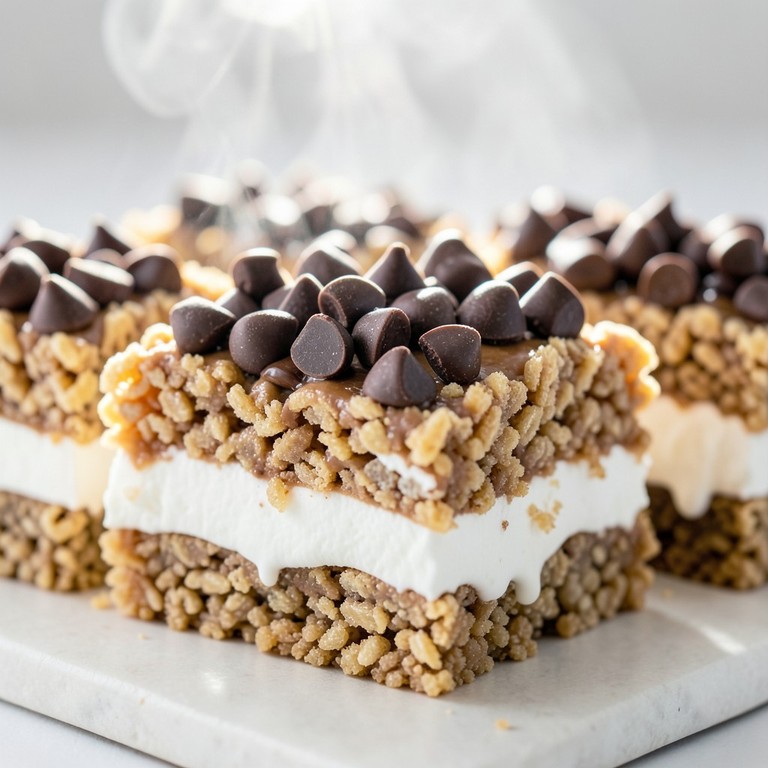 A quick and easy treat with layers of peanut butter, marshmallows, and chocolate chips, offering a delightful combination of chewy, crispy, and sweet textures without any baking required.