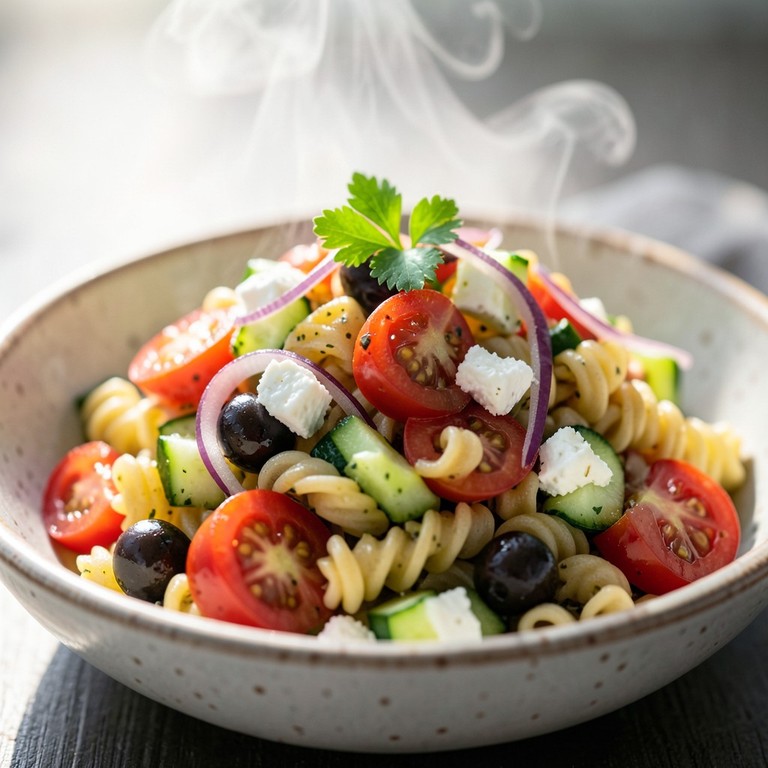 A vibrant and refreshing pasta salad featuring al dente rotini, crisp garden vegetables, and salty Kalamata olives, all tossed in a zesty lemon-herb vinaigrette.