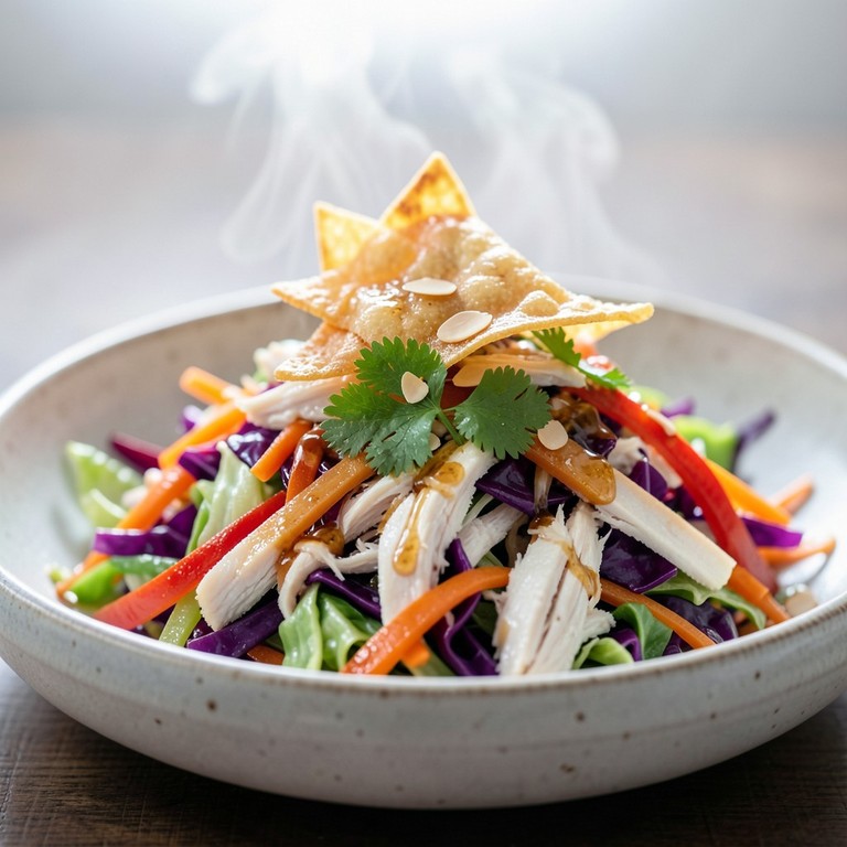 A refreshing and vibrant Oriental-style salad featuring tender shredded chicken, crunchy cabbage, and a zesty ginger-soy dressing.