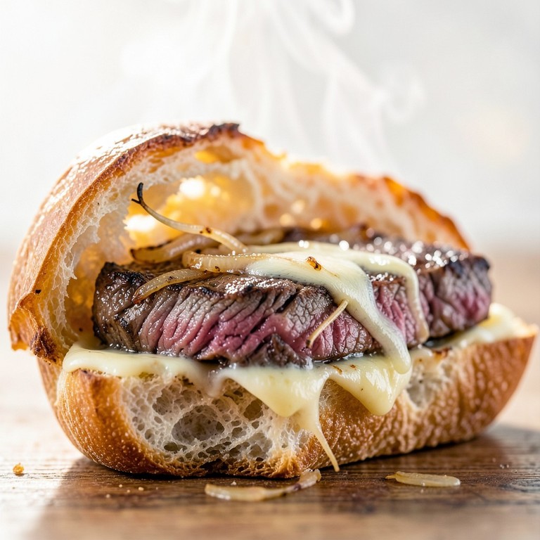 Tender slices of sirloin steak with sweet caramelized onions and provolone cheese on a toasted baguette, offering a perfect balance of savory and sweet.