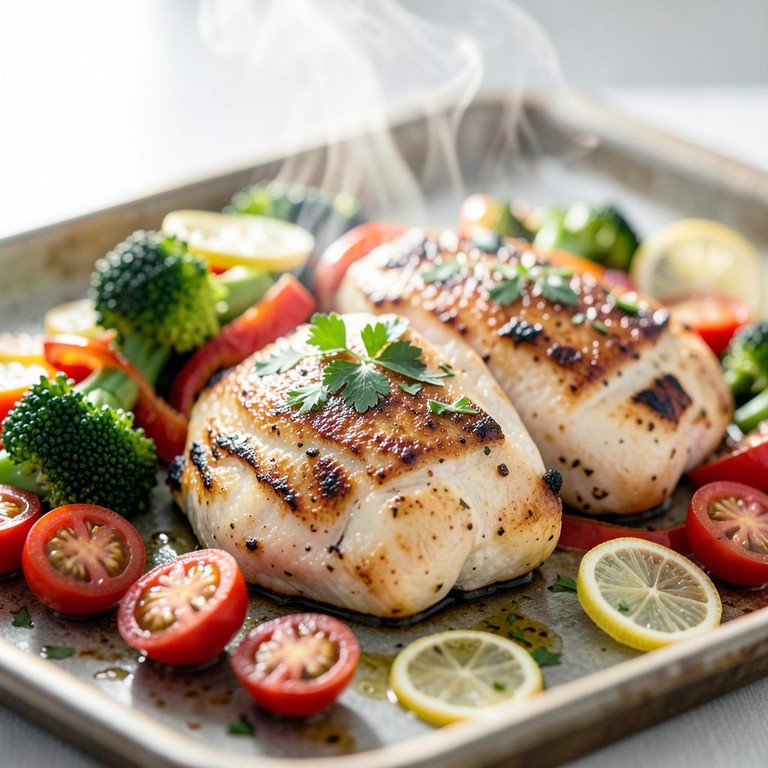 Chicken breast and a colorful mix of vegetables roasted with lemon and herbs for a complete, healthy meal.