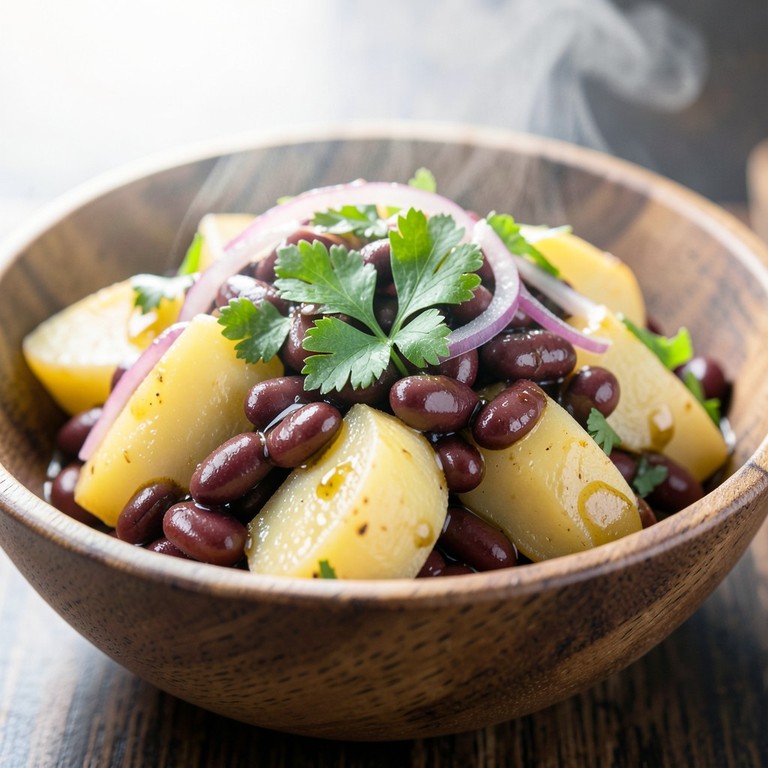 A refreshing and satisfying salad combining tender boiled potatoes and hearty kidney beans in a tangy, zesty vinaigrette, perfect for a light meal or side dish.
