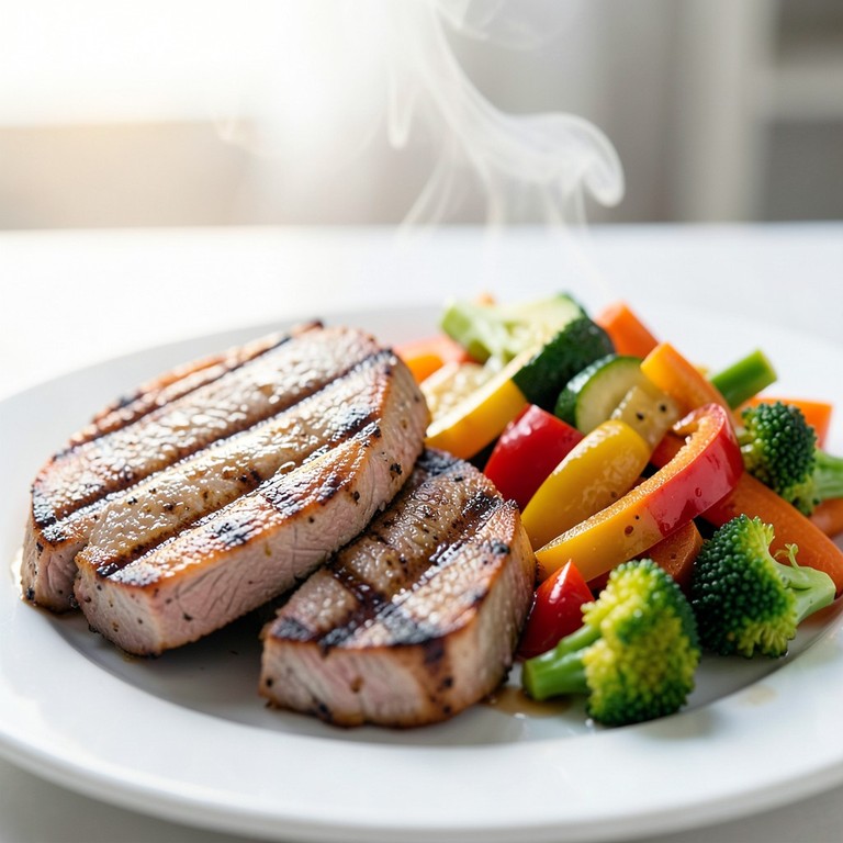 Bifes de lombo de porco grelhados na perfeição, acompanhados por uma vibrante mistura de legumes frescos salteados, oferecendo uma refeição deliciosa e saudável.