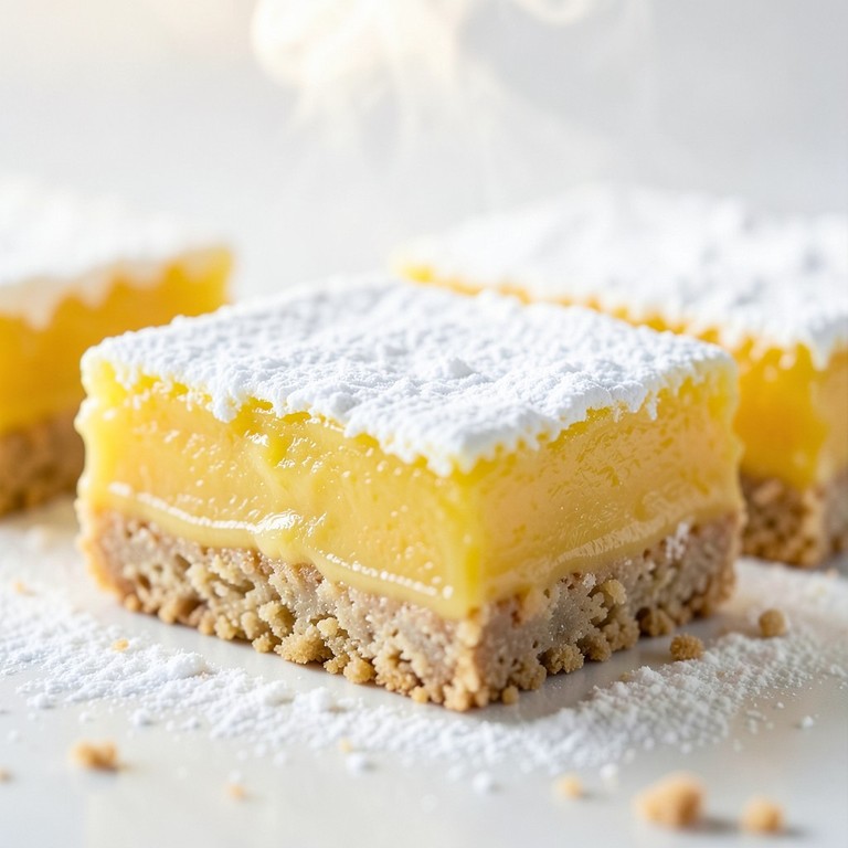 Tangy lemon filling on a buttery shortbread crust, a delightful balance of sweet and tart.