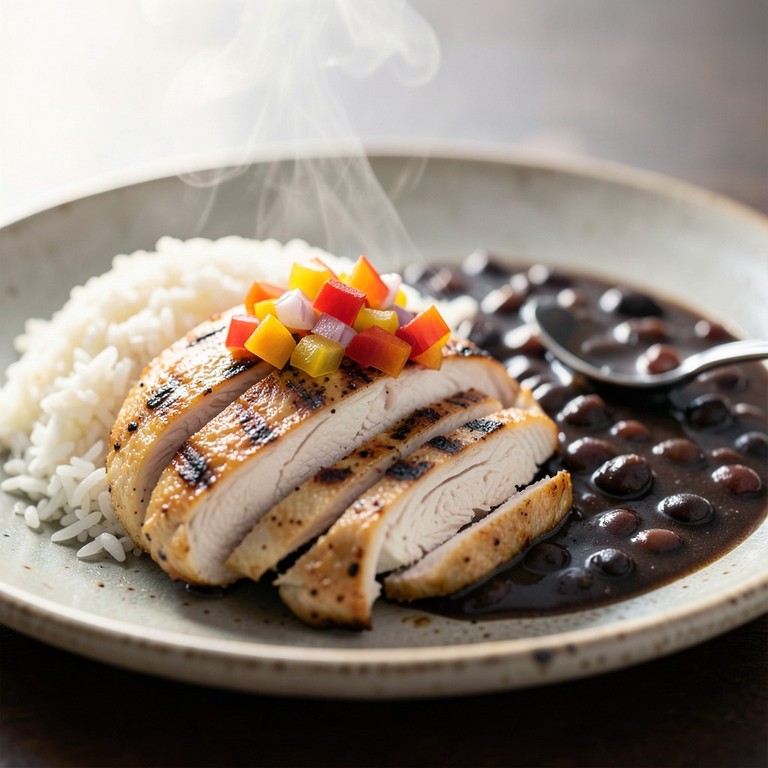Um prato clássico e equilibrado, com filés de frango suculentos e grelhados, acompanhados de arroz branco soltinho, feijão preto cremoso e um vinagrete fresco de pimentões para realçar os sabores.