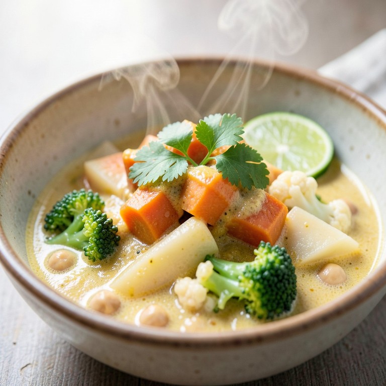 Un curry reconfortante y aterciopelado que combina la dulzura natural del camote y la chirivía con la frescura del brócoli y la coliflor en una base de leche de coco.