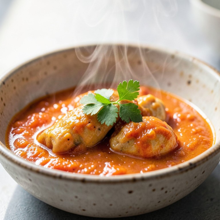 Tender chicken pieces simmered in a rich, creamy, and mildly spiced tomato-based sauce, perfect for a comforting meal.