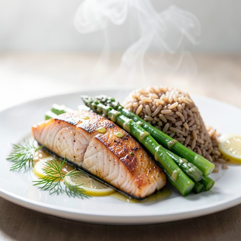 High in omega-3s, this dish pairs flaky salmon with tender asparagus and wholesome brown rice for a balanced meal.