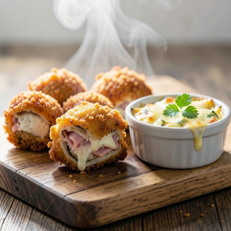 Bite-sized chicken cordon bleu for quick cooking, paired with a simple, cheesy zucchini gratin, both prepared efficiently in the air fryer.