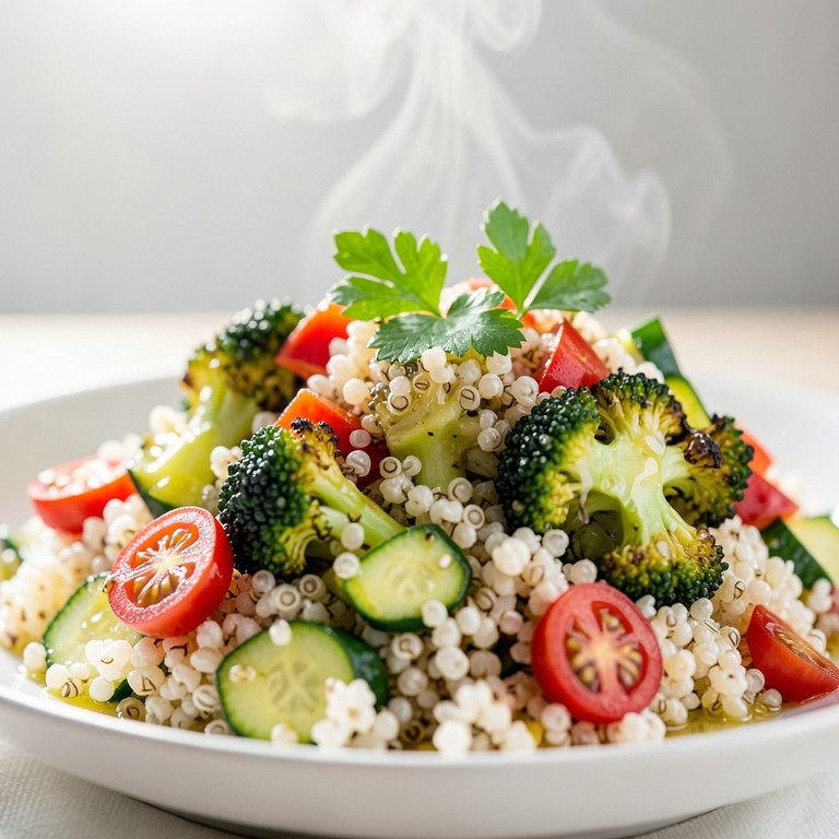 Una ensalada nutritiva y colorida con quinoa esponjosa, brócoli, pimiento y calabacín asados, todo aderezado con una vinagreta fresca de limón.