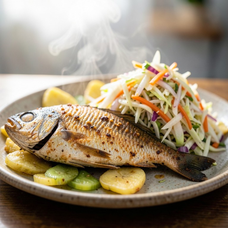 Un plato hondureño clásico que presenta pescado entero frito hasta quedar crujiente, acompañado de tajadas de plátano verde fritas y un refrescante encurtido de repollo.