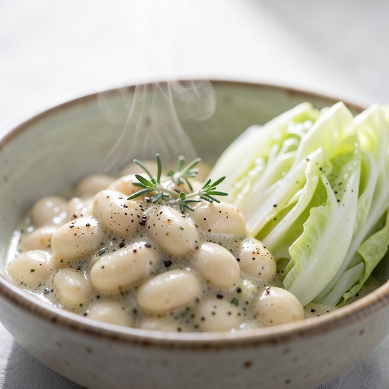 Ein wärmendes Wohlfühlgericht aus zarten weißen Bohnen in einer aromatischen Kräuter-Sahne-Soße, serviert mit sanft gegartem Chinakohl.