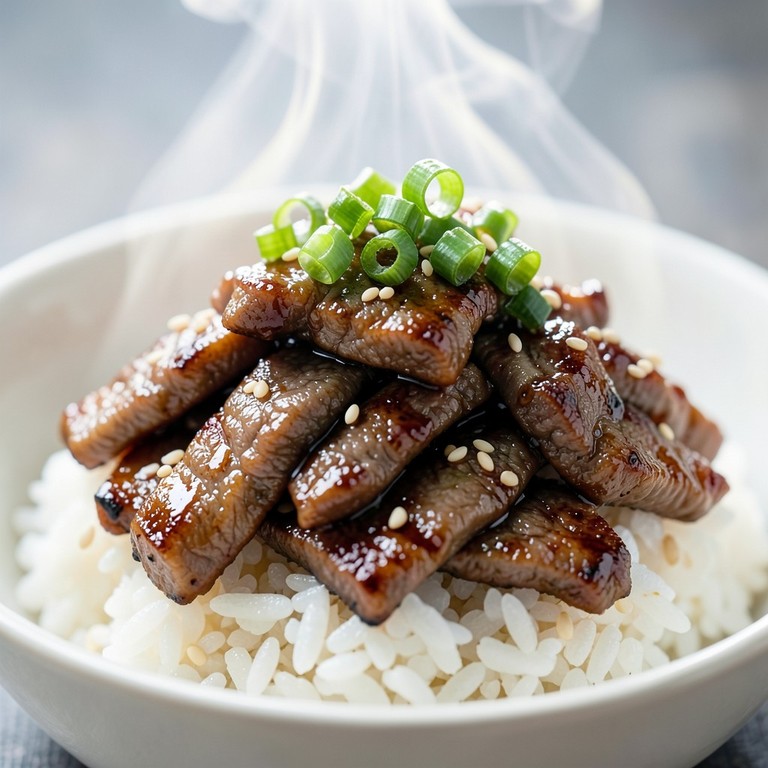 Tiernos trozos de carne de res salteados rápidamente y bañados en una salsa teriyaki casera, servidos sobre arroz de sushi perfectamente sazonado. Una comida rápida y deliciosa, lista en minutos.