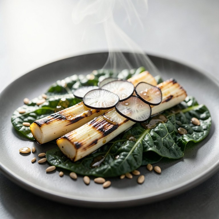 Ensalada Templada de Acelgas y Puerro Asado con Láminas de Rábano Negro