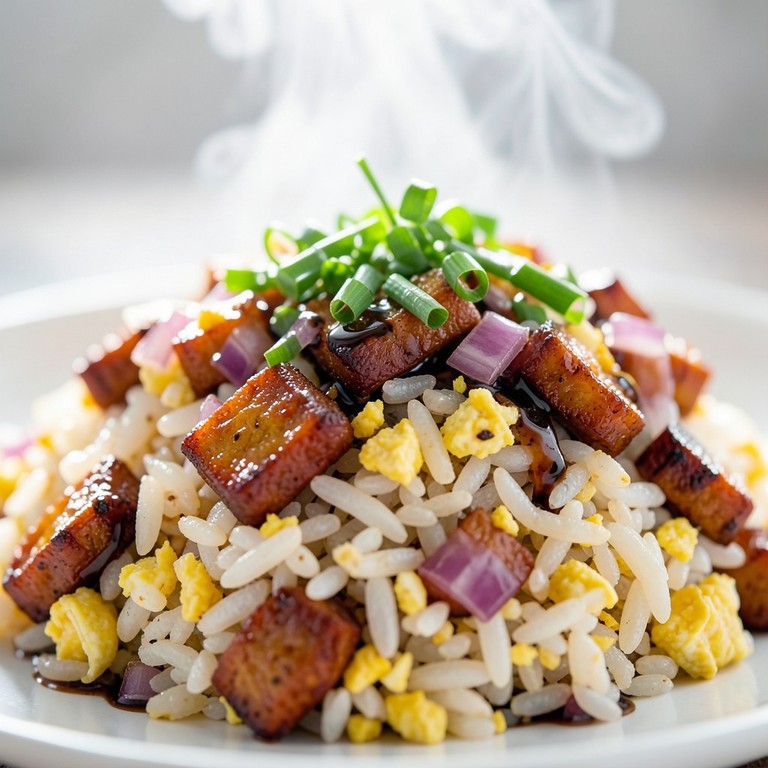 Un plato lleno de sabor donde el embutido se carameliza con salsa de soya, complementando el arroz y el huevo, creando una experiencia culinaria reconfortante y deliciosa.