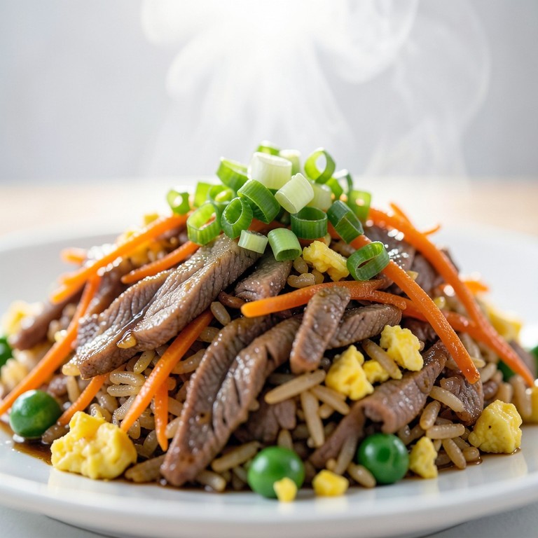 Un delicioso arroz frito con tiernas tiras de carne de res, el toque picante del jengibre fresco y la dulzura de las zanahorias, creando una explosión de sabores umami.