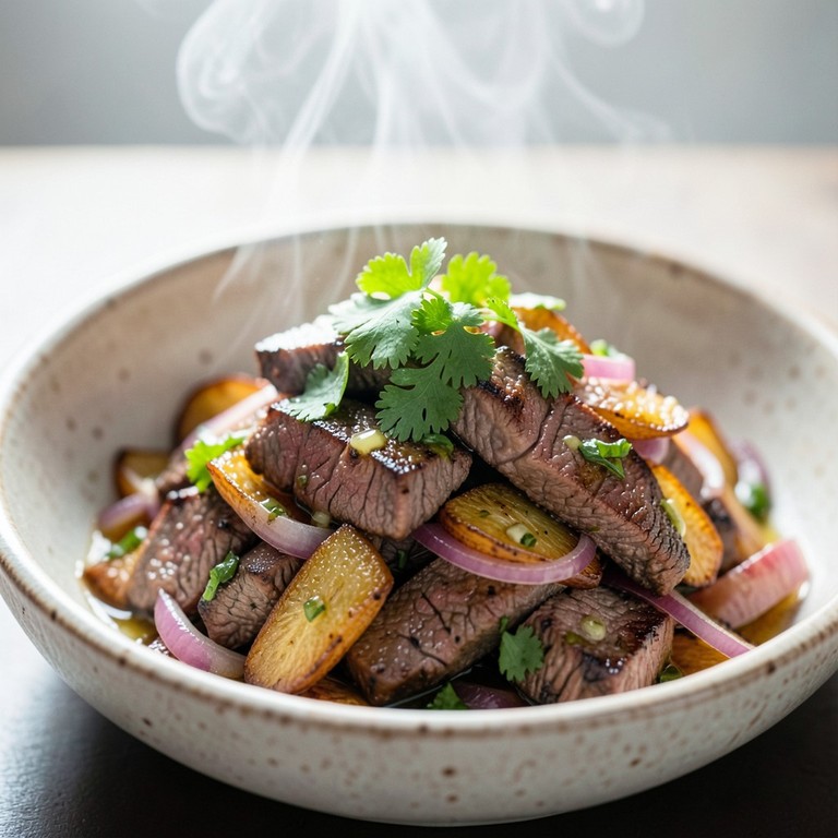 Una opción saludable y ligera, con hígado salteado y plátano en trozos, realzado por un aderezo fresco de ajo y culantro.