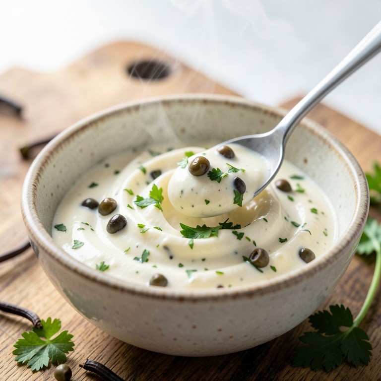 A zesty, velvety mayonnaise emulsified in the Thermomix, infused with fresh flat-leaf parsley and briny capers for a bright, sophisticated finish.