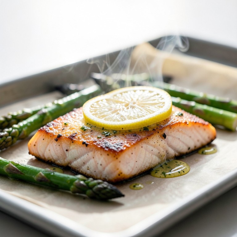 Flaky salmon and tender asparagus baked together with bright lemon and fresh herbs for a nutritious and quick meal.