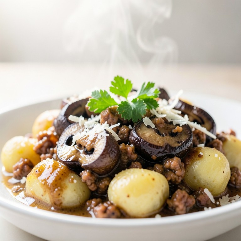 Un plato reconfortante con ñoquis suaves en una salsa rica y sabrosa, combinando la textura de la salchicha y los champiñones Portobello.
