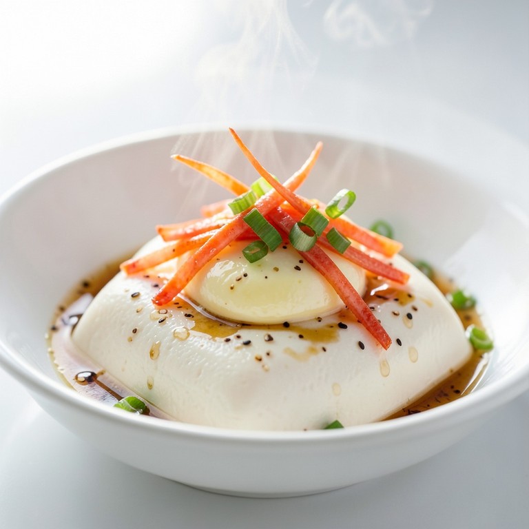 A comforting, traditional preparation featuring soft silken tofu, savory egg custard, and delicate crab stick, all gently steamed to a silky perfection.