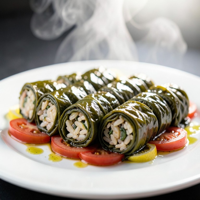 Traditional grape leaves filled with seasoned rice and herbs, slow-cooked to perfection in a savory tomato and lemon broth.