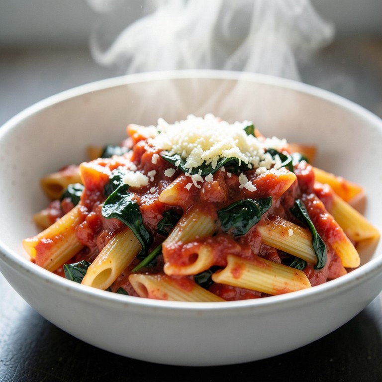 A rich and creamy one-pot pasta dish featuring al dente pasta cooked directly in a luscious tomato sauce with fresh spinach, perfect for a quick and comforting vegetarian meal.