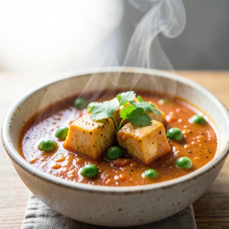 An Indian-inspired curry featuring pan-fried paneer cubes and sweet green peas in a rich, aromatic tomato-based sauce, perfect for a quick and satisfying vegetarian meal.