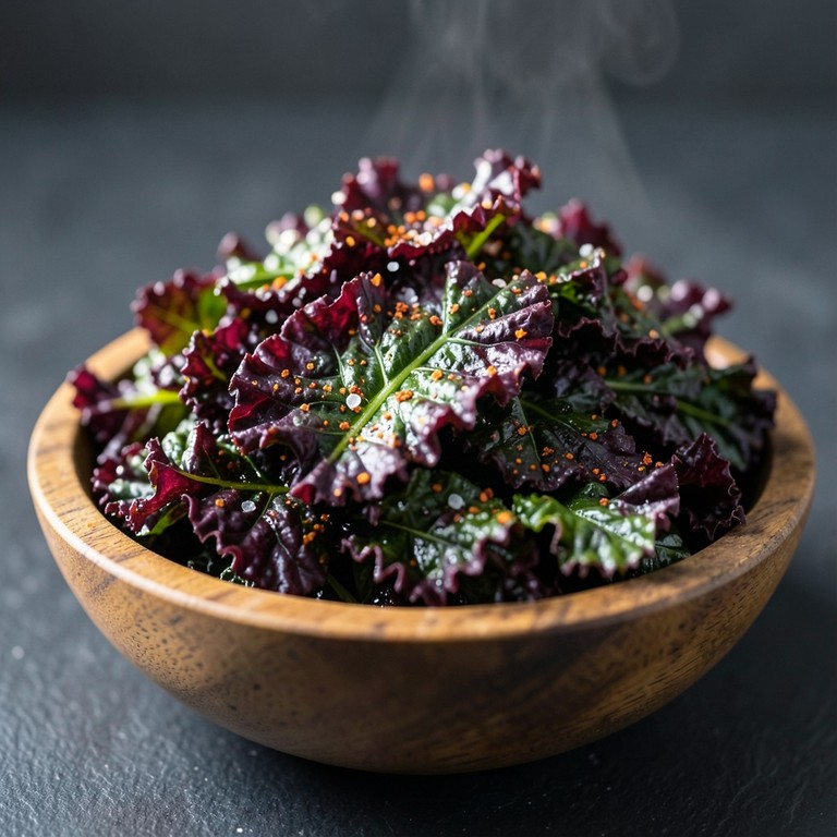 A crispy and healthy snack alternative, featuring vibrant red kale leaves seasoned with smoky spices and baked until perfectly brittle.